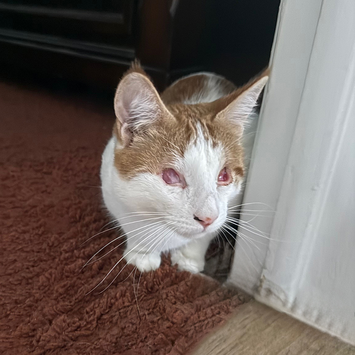 Clinton’s eyes are microophthalmic, meaning they are undersized for his eye sockets, and they are heavily embedded behind his third eyelids. After a visit to our vet and based on his foster mom’s observations, Clinton can see light and shadow. Still, his visual impairments do not slow him down one bit. He explores the world with determination, happily trotting about, occasionally bumping into a wall, then simply changing course and carrying on. Because unfamiliar sounds can startle him, he would do best with a patient family willing to give him time to adjust and feel secure.