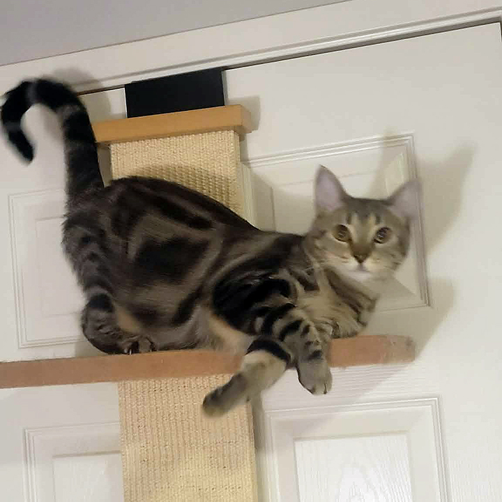 But don’t let the zoomies fool you–Daytona has a wonderfully tender side. She greets people with an enthusiastic flop onto her back, paws splayed wide in an open invitation for love. She adores lap time, purrs like a tiny engine warming up, and genuinely craves connection. Human companionship lights her up just as much as feline play.