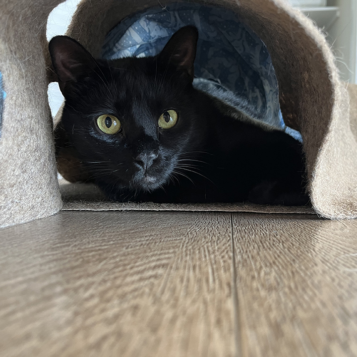 It didn’t take long for this little guy to transform into a confident and playful kitty who can keep up with his foster siblings, no problemo! He walks around the house with his tail held high (usually in an adorable candy cane formation) and happily accepts human hands reaching out to pet him. He can’t resist turning on the motor when picked up and cuddled. Harlo also enjoys phone screens and watching TV – he’ll hop up on the back of the couch so he can drape himself over a shoulder and join the viewing party.