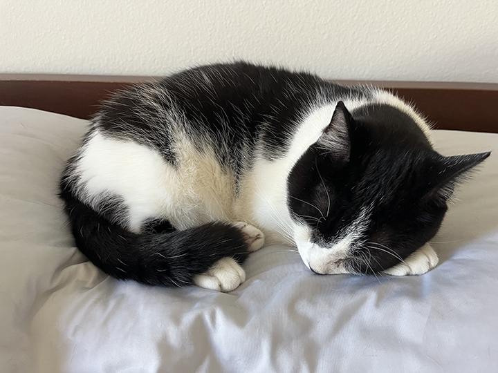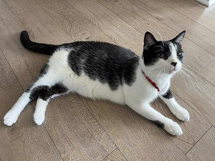 Leonhard instantly stood out as the loudest member of his family, singing the song of his people the entire car ride home from the shelter. He had a lot of questions and concerns that he wanted to share with management, most of which involved food. (Even with a severe kitten cold, his appetite never waned.) He has a fearless approach to life that is most evident in his tussles with the robot vacuum. Only the bravest of cats is willing to face such a foe.