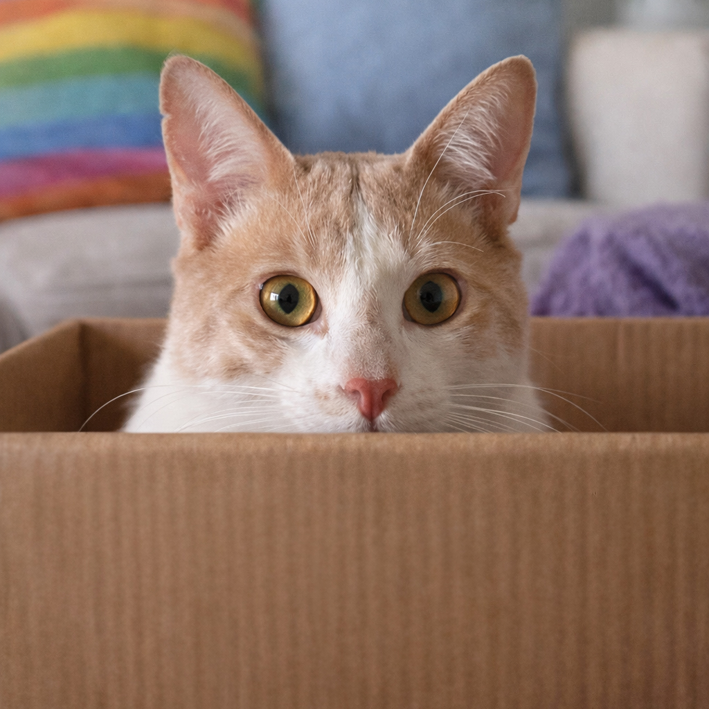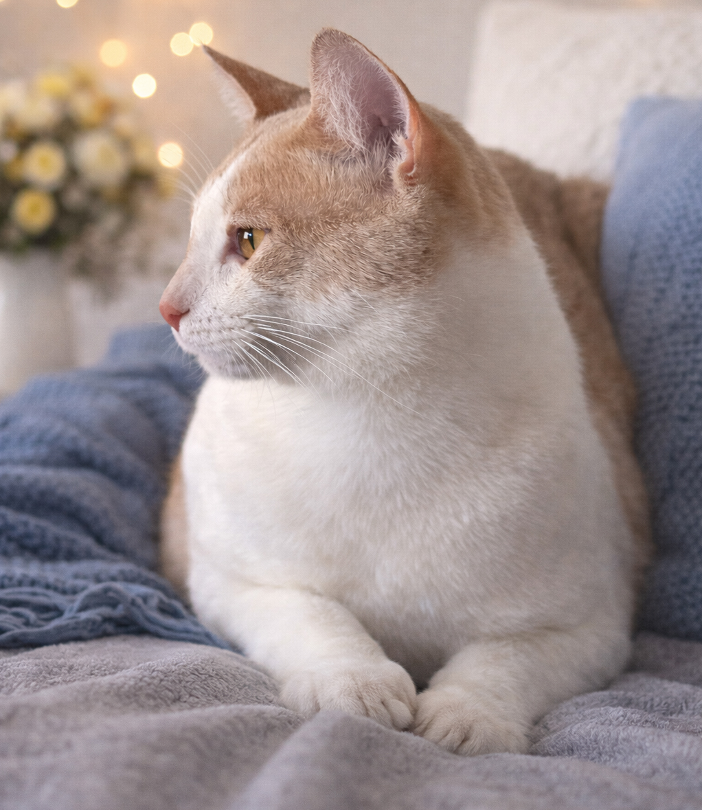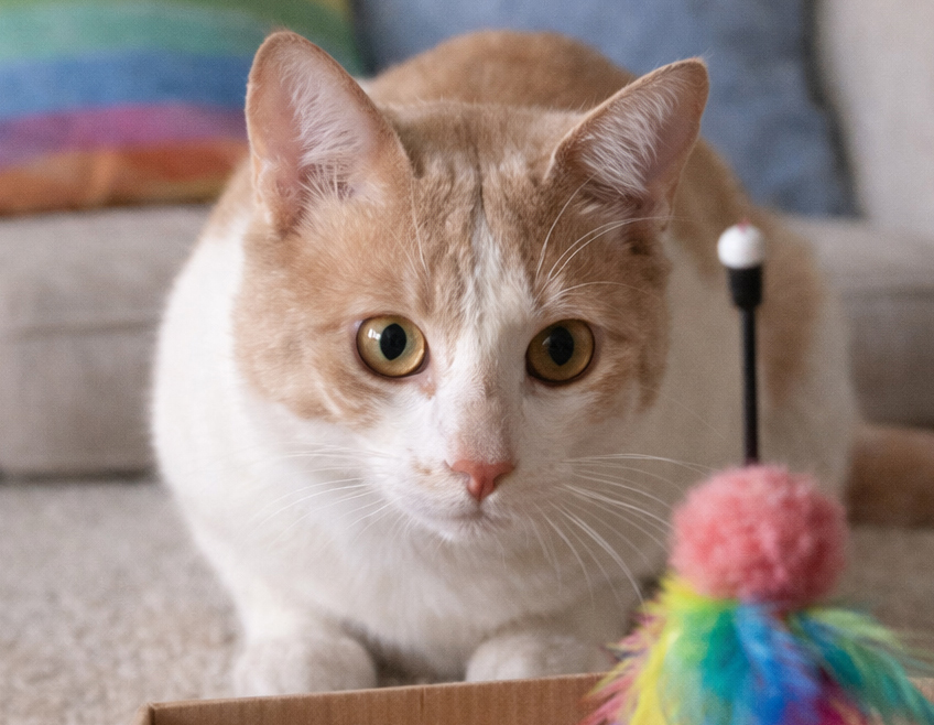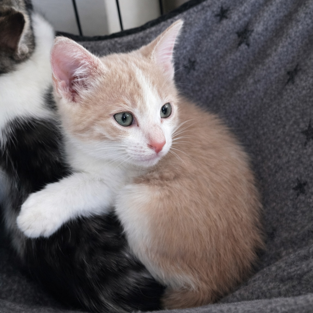 Lime is a sweetheart with a personality that’s equal parts independent and affectionate. He’s super friendly and loves to cuddle, but he prefers to initiate the interaction—if you reach for him first, he may duck away. Give him the chance to come to you, however, and you’ll be rewarded with a full-on love bug who can’t get enough pets and scratches. When you least expect it, he might hop up to your desk, shove his face into yours, and demand attention with a dramatic flop across your keyboard. That’s when his famous motor—the loudest purr you’ll ever hear—kicks in. He adores playing and wrestling with his siblings and would be happiest in a home with another friendly, playful cat. He’s dog-friendly, used to living with canine companions, and while he hasn’t met children, he’d likely be fine with respectful ones who give him space. Churu treats are the fastest way to win his heart.